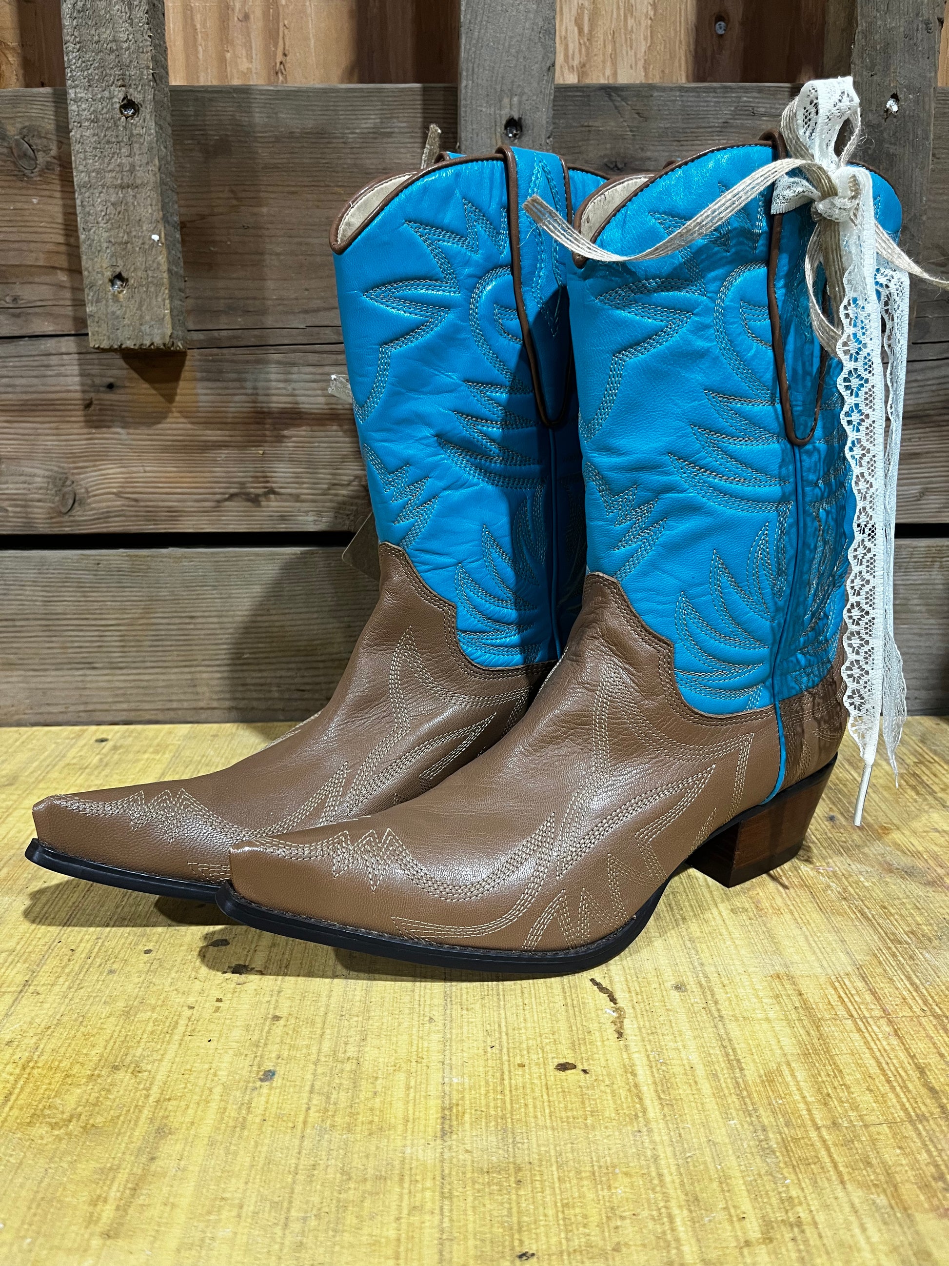 Guess by Marciano two tone, genuine, leather, cowboy boot. Features teal and brown Colors and stitch detailing.