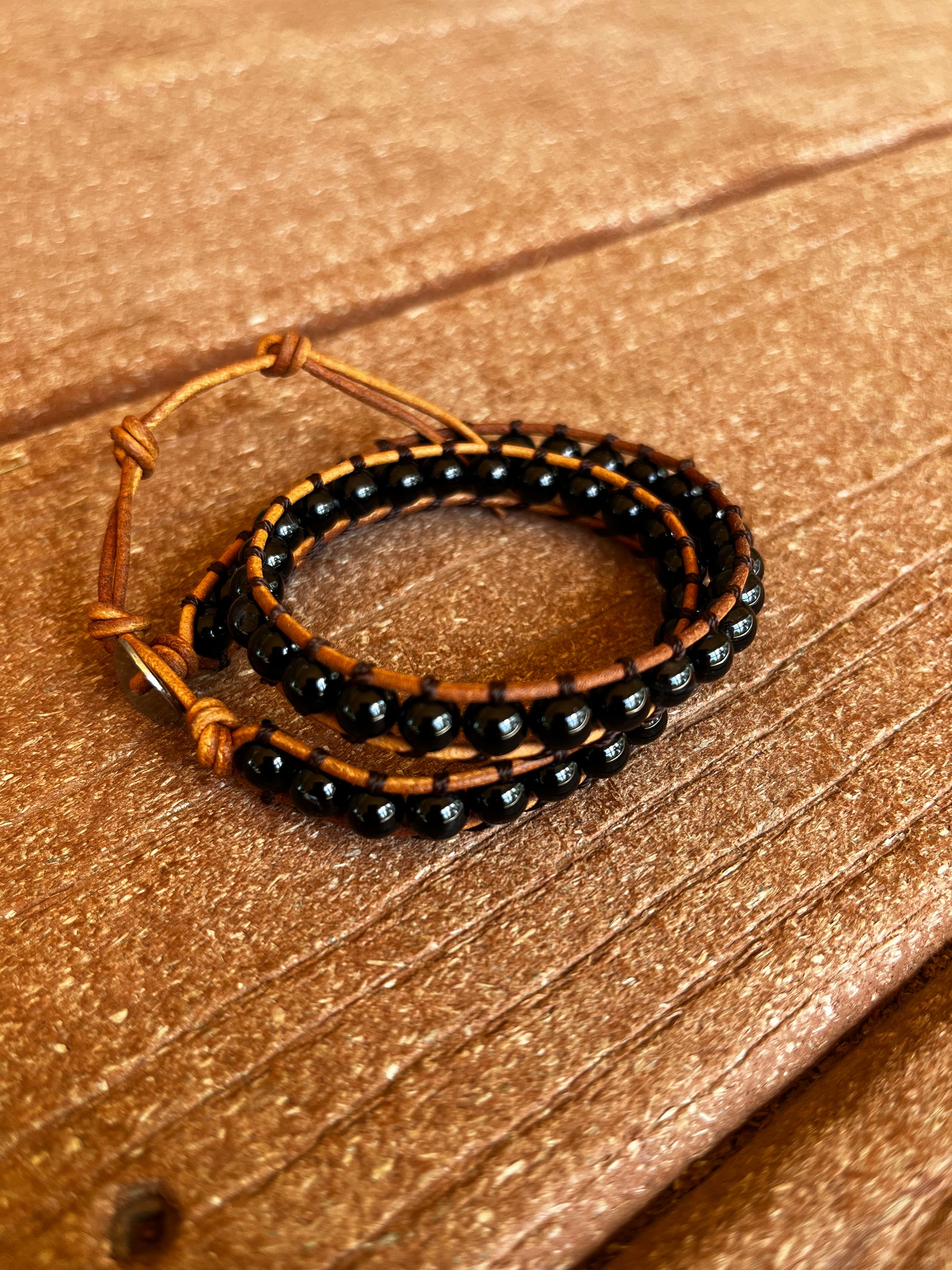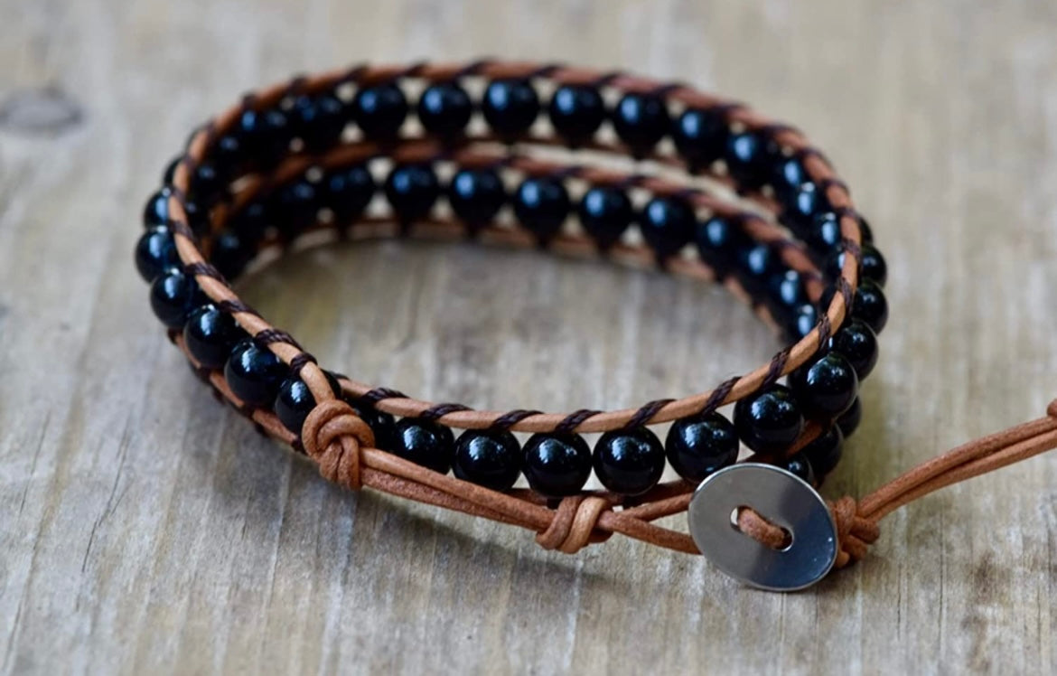 Our beautiful and unique gun smoke wrap bracelet is handcrafted with natural black agate beads, soft brown leather, and Hand-Knotted with a high quality black thread. The closure has a metal closure, you can adjust it to any of the two loops making it a perfect fit for you.
