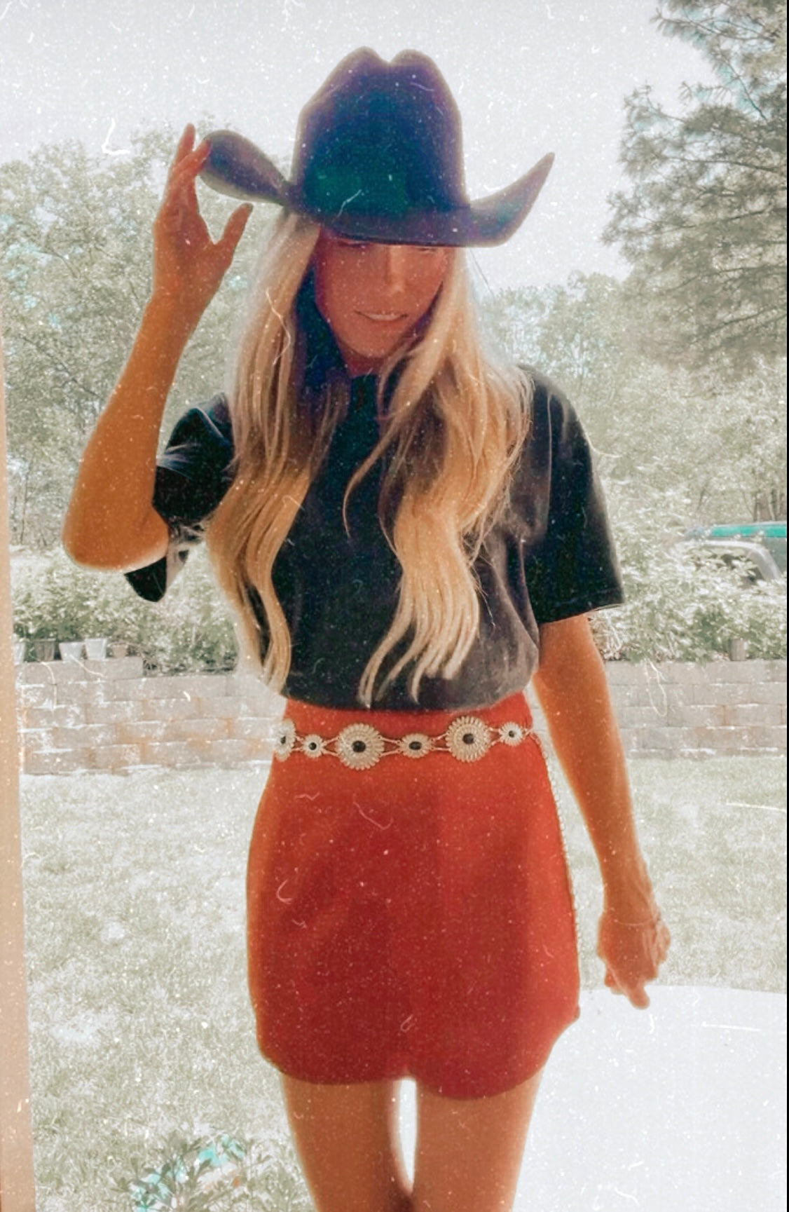 The perfect country concert staple. This red satin skirt paired with a pair of boots is an absolute must this concert season