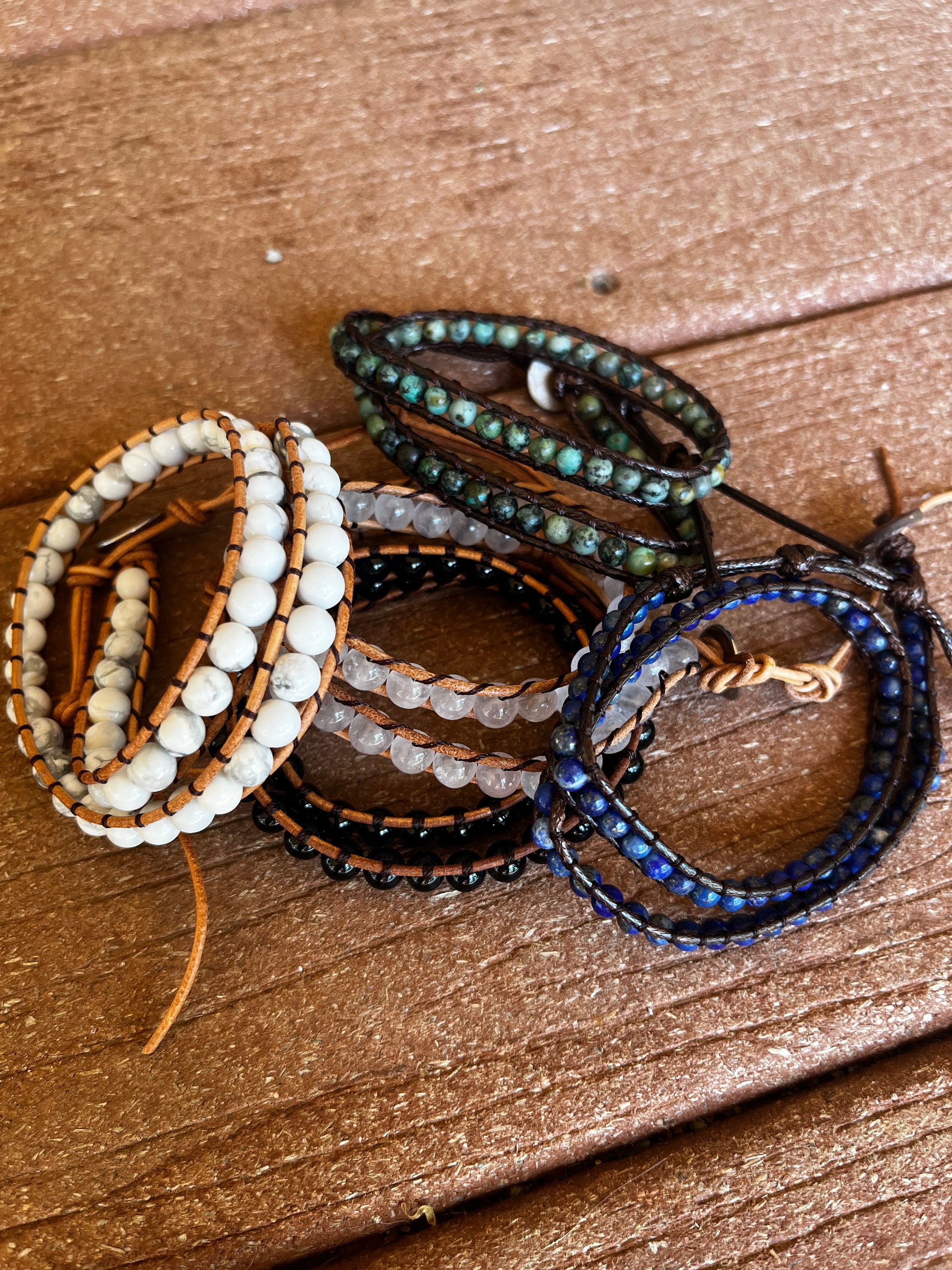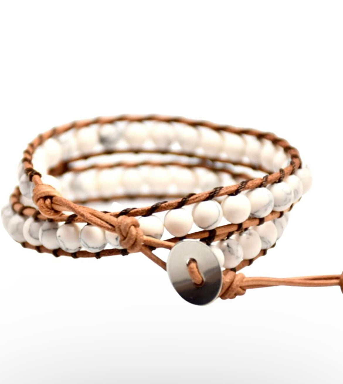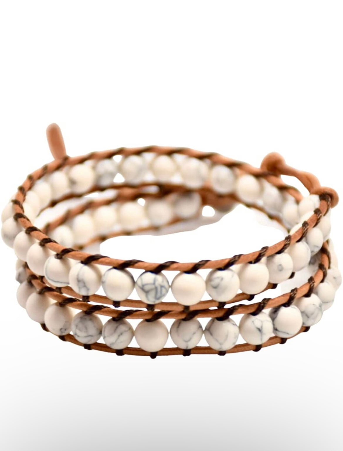 Our beautiful and unique Montana wrap bracelet is handcrafted with natural white turquoise beads, soft brown leather, and Hand-Knotted with a high quality thread black thread. The closure has a metal button, you can adjust it to any of the two loops making it a perfect fit for you.